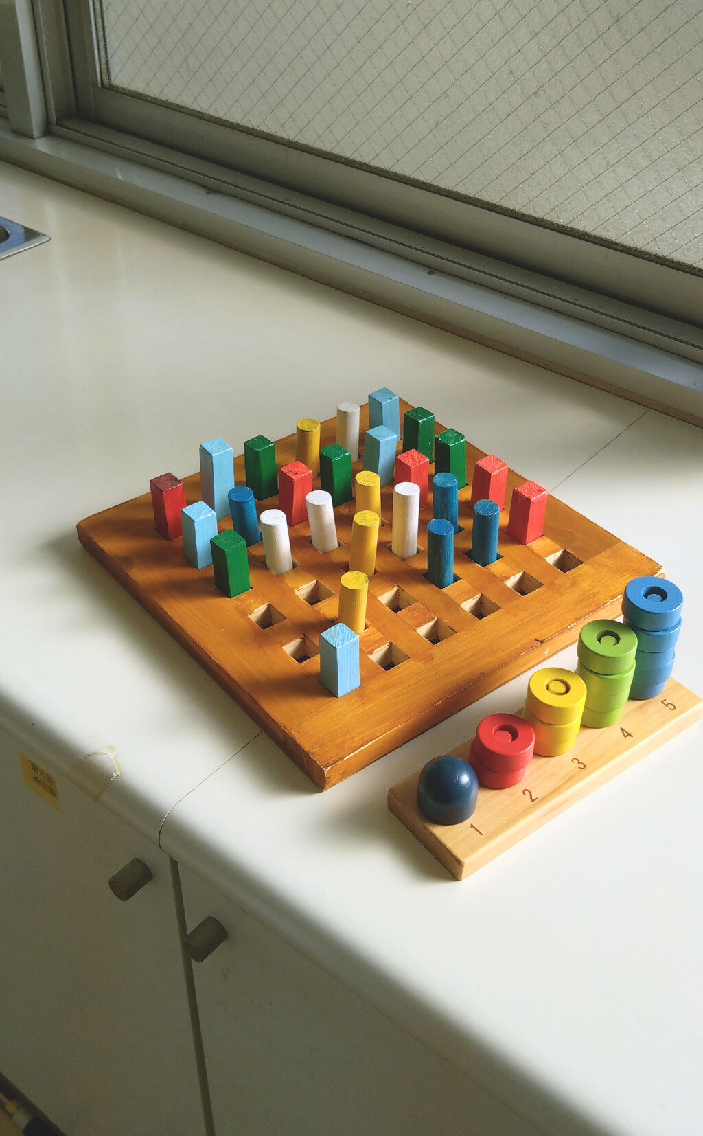 ボードの穴に棒(ペグ)を抜き差しする訓練器具です。指先の器用さ(巧緻性)、手の力加減、目と手の協調運動の向上のために使用します。